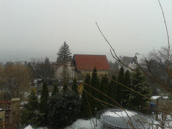 A hókatasztrófa után ónos esőt ígért Pest megye területére a meteorológia mára, ehhez képest már megint óriási pelyhekben hullik a hó Szentendrén.