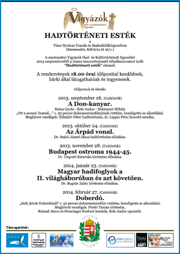 Hadtörténeti esték címmel indított tavaly ősszel öt részből álló előadássorozatot Vigyázók Had- és Kultúrtörténeti Egyesület Szentendrén a V-8-ban. A rendezvénysorozat csütörtökön a Doberdó témájával zárul